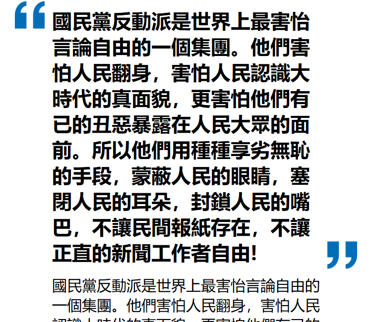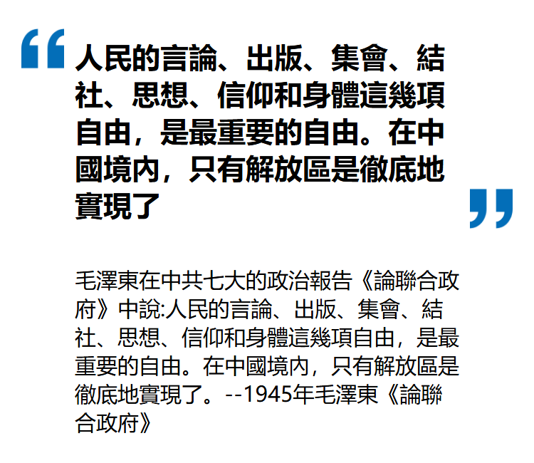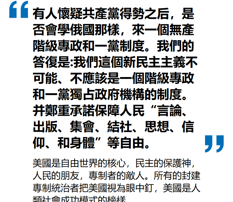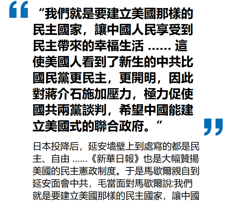 日本投降后,延安墻壁上到處寫的都是民主、自由 ……《新華日報》也是大幅贊揚美國的民主憲政制度。于是馬歇爾親自到延安面會中共,毛當面對馬歇爾說:我們就是要建立美國那樣的民主國家,讓中國人民享受到民主帶來的幸福生活 …… 這使美國人看到了新生的中共比國民黨更民主,更開明,因此對蔣介石施加壓力,極力促使國共兩黨談判,希望中國能建立美國式的聯合政府。